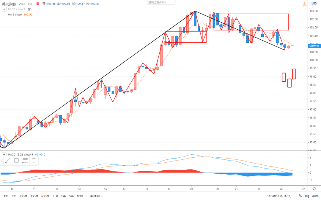 01美元指数 240分钟图美元指数目前在一笔4小时级别调整的过程中,目前还没有止跌的迹象。接下来要持续关注调整的力度,如果内部形成30分级别“第三类卖点”,日线的趋势就有可能由多转空。我将暂时继续保持多头的思路,以4小...