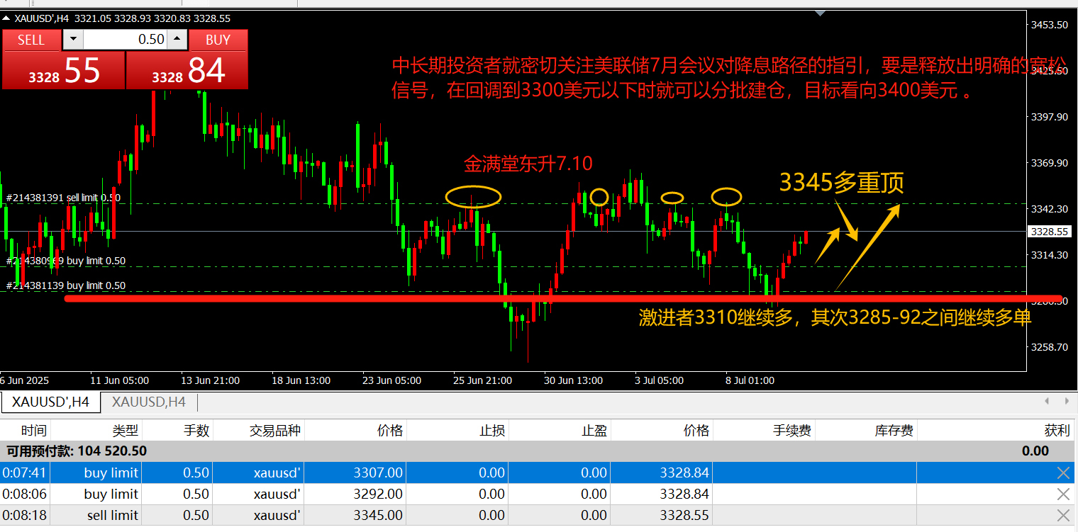 东升:7月10日现货黄金最新情况!目前,现货黄金在3318美元/盎司附近波动,最近这走势就像坐过山车,多空双方激烈拉扯。从技术面看,日线级别上,5日均线和10日均线在3320美元附近纠缠,形成了一个短期的压力位,就像一道关...