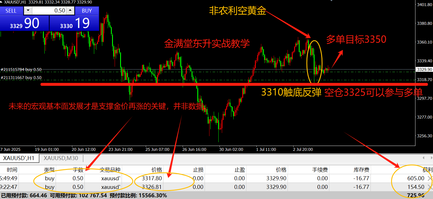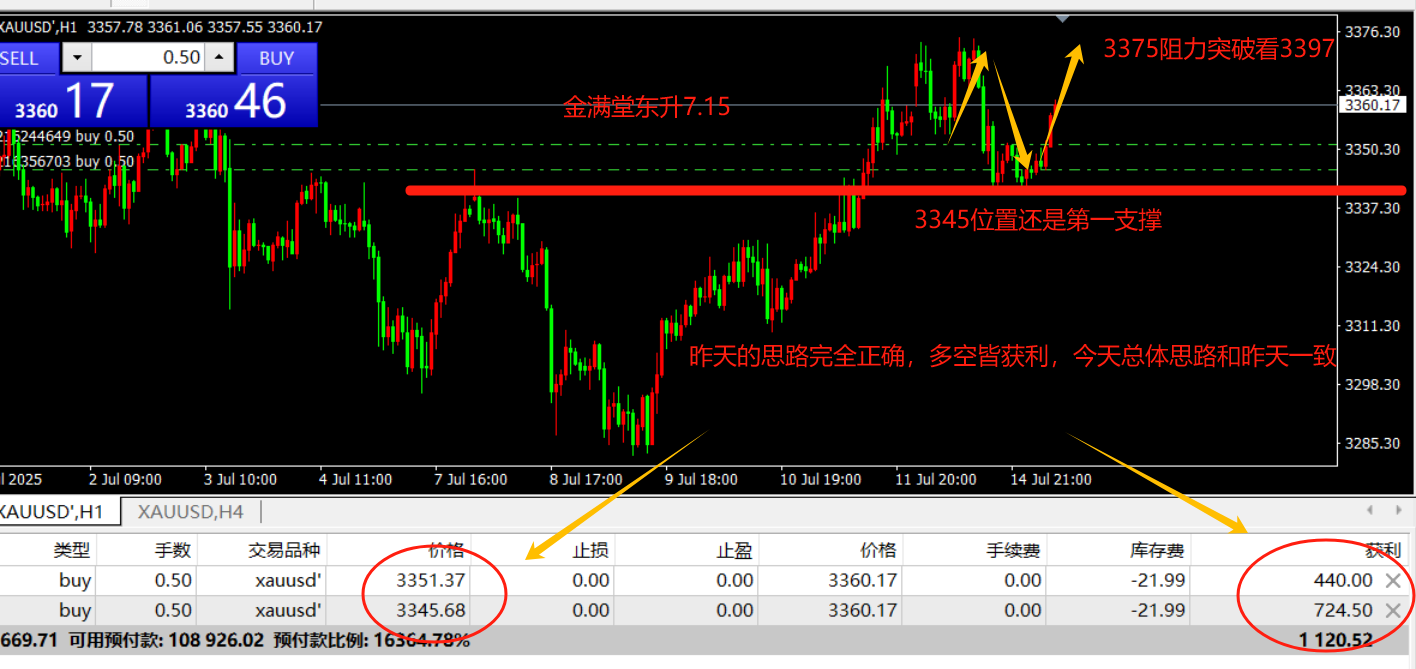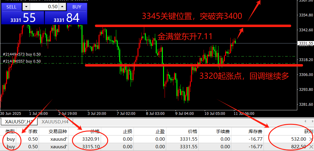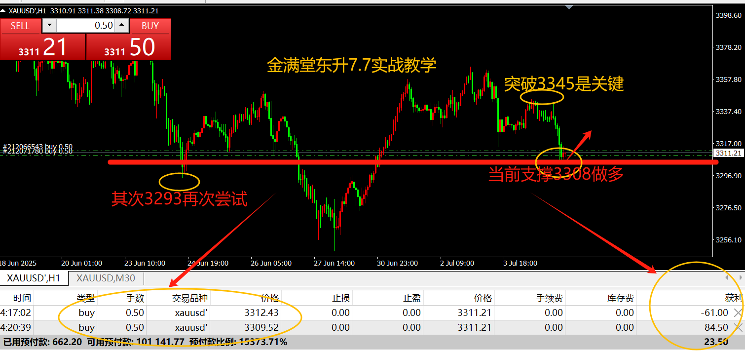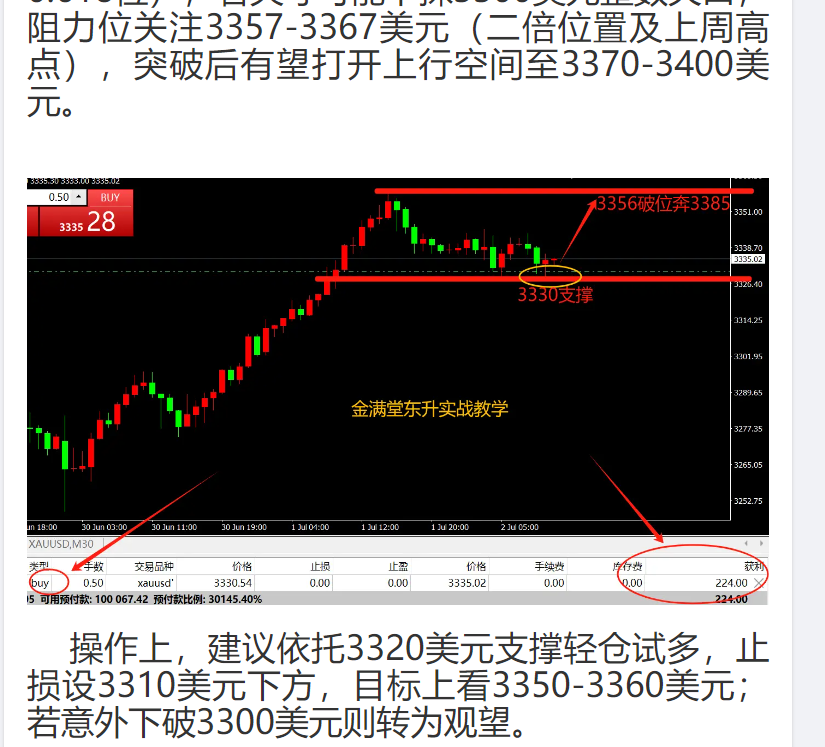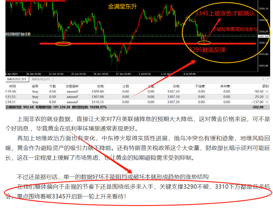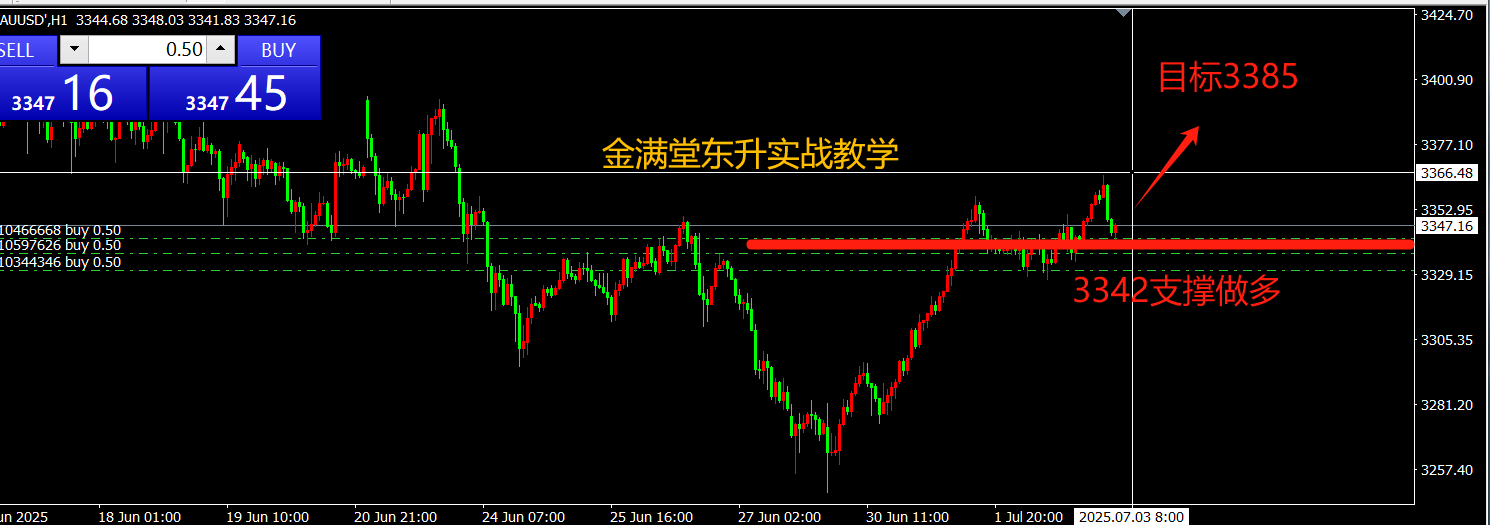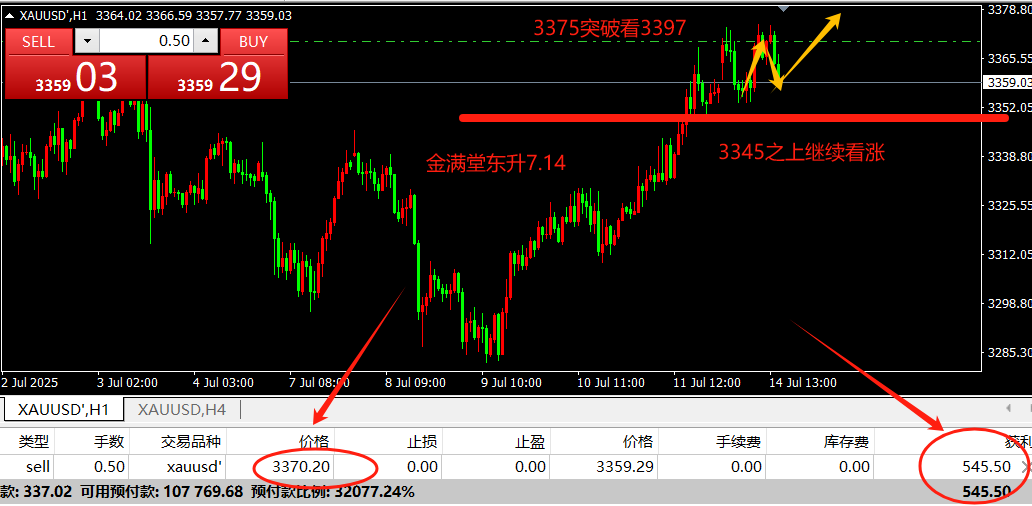 金满堂东升:7月14日,现货黄金回调3345做多,文中扫码注册账户进跟单社区!特朗普宣布8月1日对欧盟、墨西哥商品征30%关税,早盘黄金跳空高开至3373.99美元,但随后承压回落。技术面上,日线三连阳,站稳上行通道,3345美元...