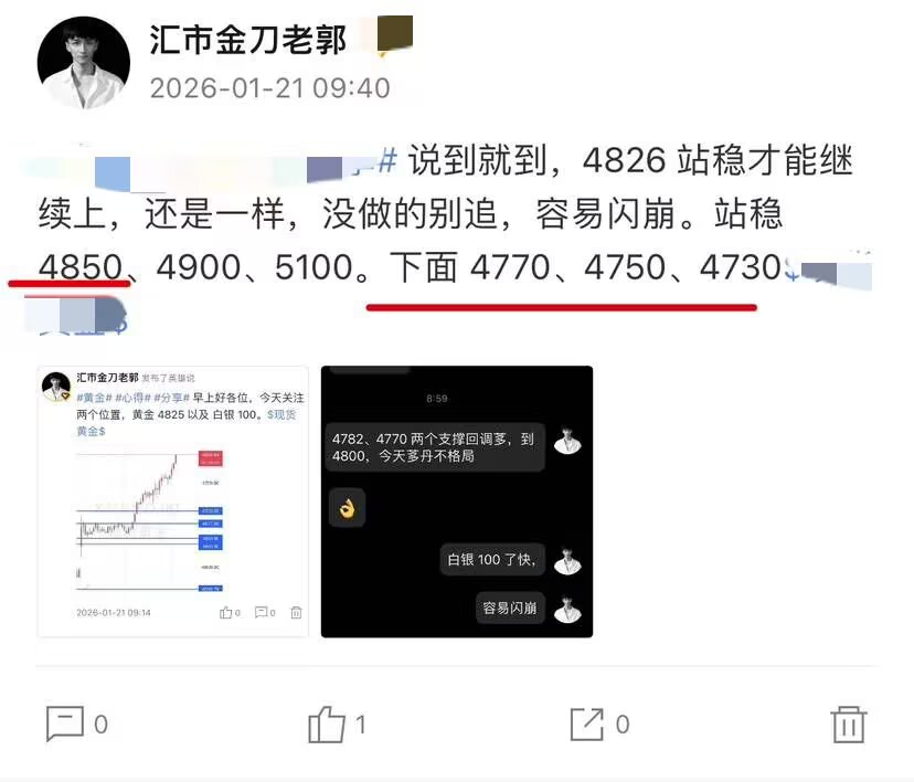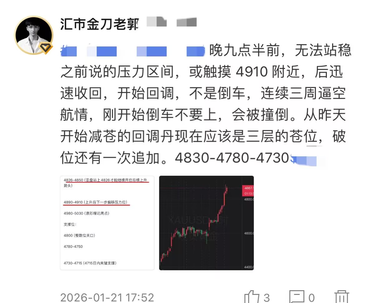 昨日预测完美验证:昨日我明确提示金价无法站稳4888-4910压力位,后迅速收回,开始回调,不是倒车,连续三周逼空行情,刚开始倒车不要上,会被撞倒。预判已被市场完美验证。川普达沃斯讲话后迅速回落至48300附近美盘时段虽有...
