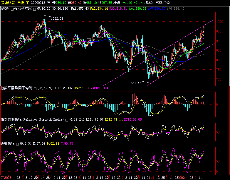在周一黄金梢作休整后,由于全球经济继续动荡不安,美国通过的刺激法案也没有给市场带来信心,反而起到了负面影响,具体今天我们不再详谈,前一篇分析已经写的比较详细了。黄金的避险保值功能支持投资者买入,昨天继续大幅上涨离笔者给的第2目标988美圆已经不远,黄金创下7个月的新高,最高至973.90美圆,收报969美圆,收了一根大阳线,稳稳的站在5天均线上方,日图上看,各均线呈多头向上发散,指标MAVD已经处于超买,RSI 在高为横盘,KDJ继续上扬,综合显示今天震荡偏强,但由于连日来的上涨,我们要警惕高位回落的风险,目前已经快触及上通道的上轨,我们要保持警惕。长期来看,黄金继续看涨。