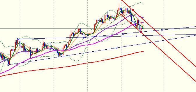 日线图来看,金价在触及高位后回调,目前受支撑于布林带中轨,KDJ依然向下散发,MACD绿柱子继续放出,四小时图布林带依然向下张口散发之势,KDJ指标运行到超卖区MACD绿柱子缩短,日内会出现反弹,一小时图,金价现在运行在下降通道内,短期上涨压力很大,如下图所示: