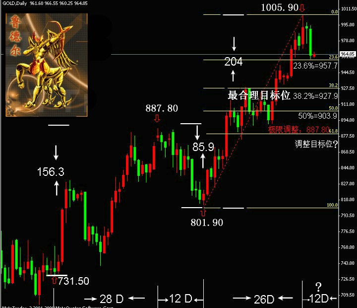 从技术面来看,金价在连续两周上涨之后收出一根大阴线,而且回吐了近38.7%的涨幅(如果以金价自800.90美元到1005.85美元的涨幅计算)。但周线图中MACD依然多头排列,金价依然徘徊于5周均线附近。而日线图中,金价虽然“五连阴”,但其后半周下跌幅度在减小而日K线之下影线却在拉长,也显示了金价下方支撑非常强劲。这更符合我上周周评中关于金价最可能在黄金分割线38.2%的目标927.9美元附近获得支撑的判断。如下图: