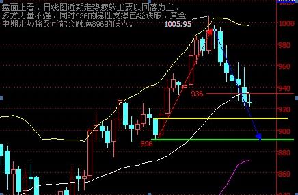 投资涉及风险,买卖黄金价格可涨可跌,近期黄金走势偏弱,多方买盘不强,926支撑已经跌破,中期走势金价有望下探896一线。操作上详情请关注###行情播报及风险提示。具体操作我们将以行情播和####的形式通过会员渠道及时告知您。