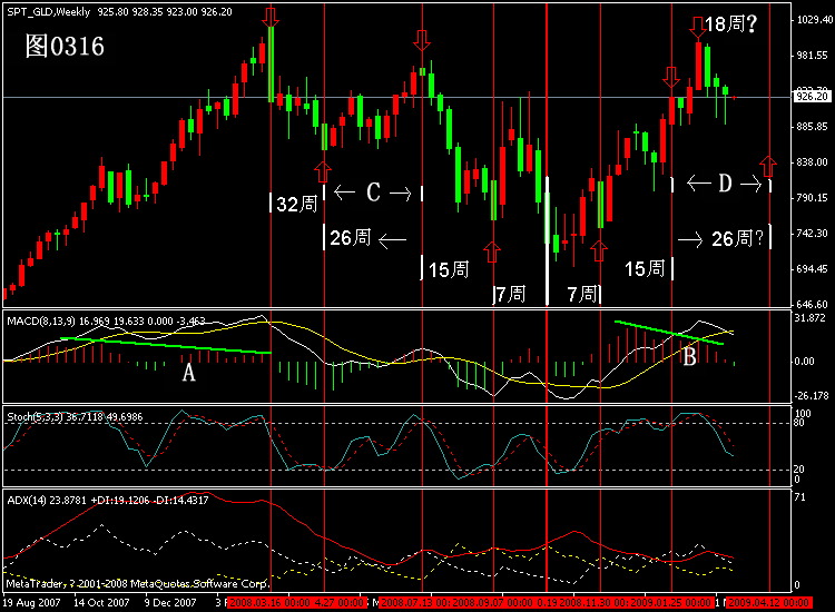 在周线图中,以金价下行至680.80美元当周为中轴,自后向前推演,金价分别在向前的7周、15周、26周、32周见顶或见底。而自此向后推演,金价在7周、15周见底和见顶。对于其在18周创出新高,笔者以为,这应该算假突破。因为这段时期MACD柱状线并未跟随金价创出新高而走高(见B处)。同样的情形发生在2007年于1032美元见顶(见A处)。