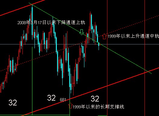 从图表上看,金价自681上升以来历时18周,而小周期预示之后为14周,构成32周循环周期。突破千元关口后,现货金展开回测,再次连续3周以阴线后本周很可能以阳线报收。目前,金价有效下破了1999年以来的上升通道的中轨支撑,但运行在1006—988压力线附近,如能上破888美元,则可冲击上升通道中轨915美元。