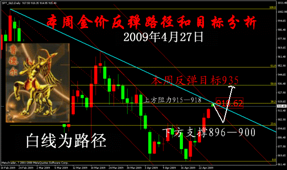 从时间周期来看,以2008年10月19日当周金价最低点681为中轴,向前26周至2008年4月27日当周,金价在844触底反弹;以681开始向后26周至2009年4月12日当周金价达到低点864后开始反弹。由此观之,金价反弹还将继续。如下图所示: