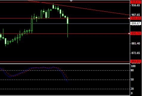 从日线上看,昨天形成的K线与前一天的收线,组成了乌云盖顶的信号,而下方的重要支撑就在890附近,而今天的亚盘也走出了行情,最低达到886左右,