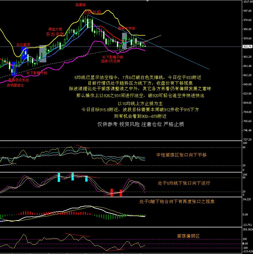 操作建议:5和10均线分别位于926.7和931.5,22均线拐头向下66和135均线处于行情下方的一道多头防线,由于日线收盘价处于下移过程之中,那么我们在操作仍以沽空思路运行,继续保持沽空为先。