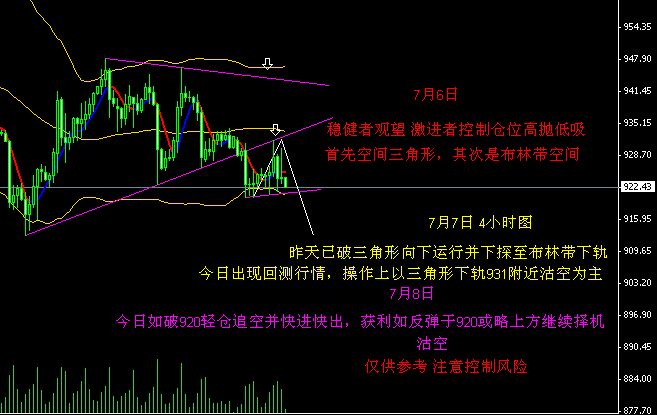 (策略)926/928.7附近有受压现象可轻仓沽空,如此处不见压力现象可于930处进行沽空,止损于可设置于933之上,或无资金压力者可于行情突破933回落时离场观望。依然和昨天相似,但今天破920可轻仓追空并快进快出。