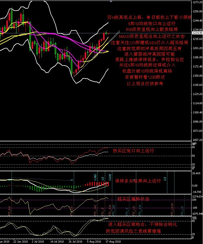 日K图:高低点上移,高位报收十字小阴线,5和10均线金叉张口向上散发,分别位于1220/1210附近。MACD红柱增长,DIFF和DEA处于0轴上张口向上运行。随机KDJ指标处于高位并有粘合死叉之意味,MT4软件的STOCH随机指标已在超买区死叉粘合之状态。RSI处于热买和越买区张口散发向上。从画线来看7月29和8月11日低点连线其低点支撑位于10均线1210附近。