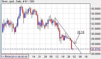 短線價位暫於26.75與27.25間整固,及後傾向下試26.00支持,進一步失守回調目標下移至24.94、24.36甚至23.10。短線阻力在28.16,升穿跌勢呈暫停訊號並重新上望30.22或30.40。