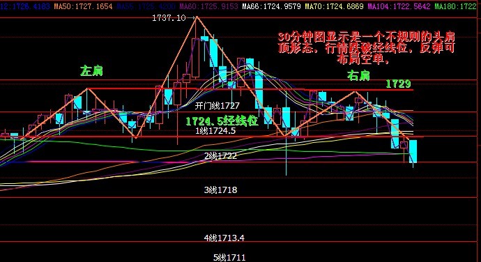 昨天现货黄金冲高回落走势,和我分析反弹修复,继续逢高布局做空思路一致,从昨天现货黄金收线来看,目前黄金的方向不是很清晰,4小时收线上看,长上影线站蜡烛线过半,是一个偏空信号,而小时半小时线显示出不规则头肩顶走势,短期黄金或酝酿新的下跌走势,所以暂时性的操作以区间高空走势为主,大区间1733-12,今日现货黄金上方压力1729  1733.支撑1718  1712.亚洲盘则是关注行情测试3线支撑1718为主,操作上稍偏空。