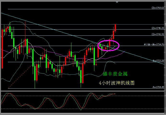 4小时波神凯线图,昨天从开门第一线上升到3线,收于3线下,即是收于1758,短线看涨,中线看涨,支持位1745-1735-1715,压力位1765-1780-1790.