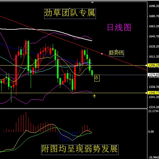 周线图:从本周期图上看K线的排列连续出现四组一阴连接一阳的“重复式”组合形态,同时排列趋势属于阶梯下行,高点逐渐在降低,MA5和MA10于1595位承压多头攻势,boll形态继续朝下发散,结合K线所能判断的支撑位分别为1568和1548,若金价再度跌破1568恐将再度刷六月份的低点从而回踩1530位。