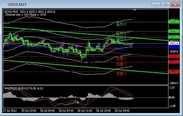 操作策略:当前价格1621.6,转折点1620.1,建议1624做空,目标1620,继续突破1615 1610,午后无法突破1620空头平仓做多,目标1624继续突破目1630 1640。