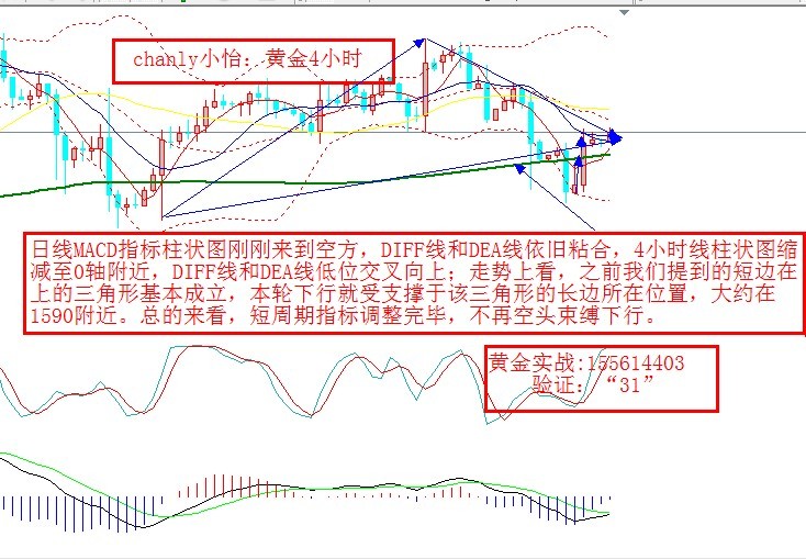chanly小怡分析:目前的价位在1605附近,从30分钟图来看,早间应该还会有一波上涨,先关注1609附近的阻力,早间受阻之后可以轻仓下空,下方的支撑看1601,较强的支撑在1590-1585。从4小时来看,MACD有金叉的迹象,形成了金叉之后,我们可以等待突破1609阻力后进多,上方阻力看1613-1616-1620-1625。现货黄金周三亚盘震荡,欧盘前后小幅刷新下跌低点至1590美金/盎司,自美盘开始反弹,最高上试1606美金/盎司,随后金价千六以上震荡,日线长下影阳锤线报收。黄金先抑后扬,日线成功收阳,结束两连阴下跌,连续两日长下影,日线看调整已到位,多头有望借势上涨;四小时大阳吞没当日跌幅,走出V型反转,突破1604一线前高,形态上已经是反转信号,随后价格维持在千六以上小幅整理,符合强势整理特征,但这样的涨幅相对两日的下跌来看,幅度仍然较小,chanly小怡较为谨慎的看待目前反转,认为金价还将围绕千六一线展开震荡,形态上甚至可能下探1598-95区间,做出头肩底形态稳固后展开上攻;小时线美盘反弹走出V型反转后进入震荡,形态上更倾向于头肩底走势,下方关注1598-95区间做多。