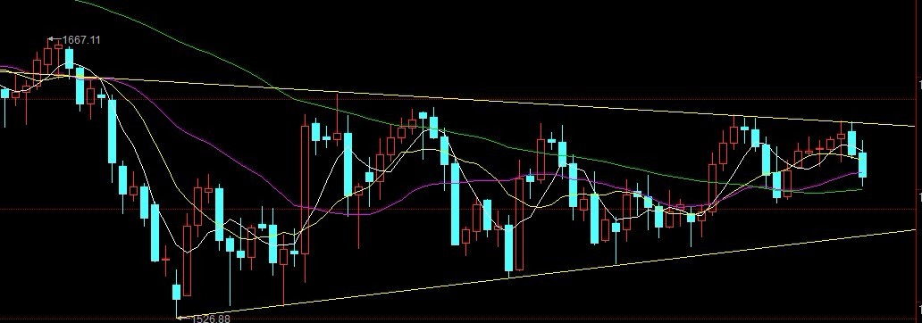 行情震动剧烈,短线操作需要谨慎,价格迫近1630长期压力带附近,等待方向上突破。