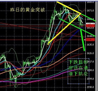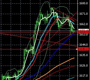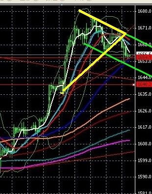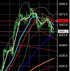隔夜黄金下跌。早盘我们对形态做了一个初步的判断。也就是4H黄金面临3角突破。欧盘下破1665.8时。我们做了第一次短空。1662.8进行了第一次平仓。回抽突破点做了第二次空单。1659.8平了仓。下跌1653不破。我们于1655.8做了第一次多。1658短线平仓。隔夜挂单1657.3于早盘微利平仓。
