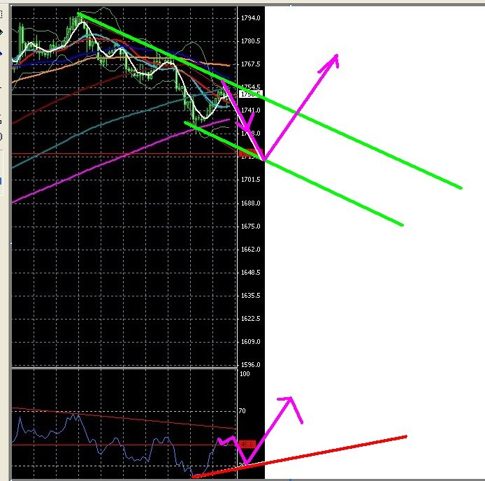 黄金的4H的200日线。也就是1755-1758遇阻。然后完成2次下跌。前面的底部1728被突破或轻微的被触碰。同时RSI应该在30附近见底,最后见底。