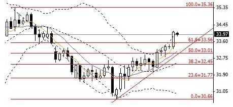 白银上周周线收出长阳,日线经历一周震荡蓄势,重心上移,在周五晚间形成上破,力拔千钧力有未尽,本周初或将延续升势。操作上以逢低做多为主,今日回落 33.7-33.8 附近可多,跌破 33.6 离场,上看 34.4,34.3,34.5 。