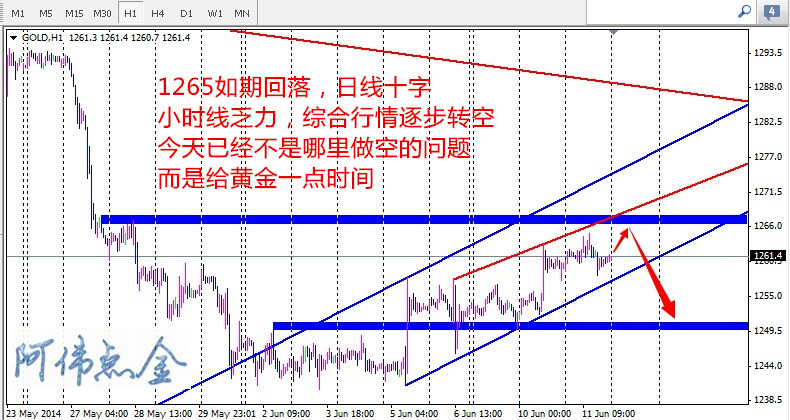 周初我们已经定义本周行情先反弹后下跌,主要基于周线收阳并且日线非农打压后仍然回升,虽然周一受阻后我们看空了一天,最终行情突破了1258,但整体交易思路还在我们的预期中;今天已经周四,本周剩下的时间已经不多,如果要下跌也就今明两天,反观金价周二拉升后,昨日多次刷新反弹高点而不上,最终日线回落以十字收线,小时线上的乏力已经表现出来,而操作上,昨天最高到1265位置我们已经入空,还是那句话1260之上不追多,1265之上中线做空,接下来的时间已经不在于哪里做空了,毕竟前半周刚刚上涨,行情即使下跌也需要一点时间充分受压转换下来,这毕竟不是极端行情暴涨暴跌,所以给行情一点时间;日内走势,今天1265之上位置恐怕难给了,激进1260之上就得开空,另外下方支撑在1250一带,这两天不出意外就会到,但能否下破存疑,因为关系到周线的收线,这个我们持续关注,留待下回分解。