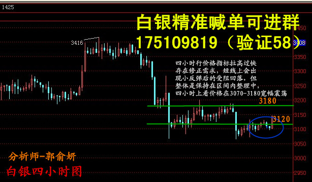 4小时图上继续运行于通道的中下轨3070-3130之间运行,反弹力度比较薄弱,未能站上中轨3130-40阻力,银价继续偏弱下行,但是未破位3070的空间是有限。另外上轨阻力价格在3180,关注3070-3180的区间,建议操作短线区间为辅,关注整体宽幅区间操作;实力**团队**19附加58即可