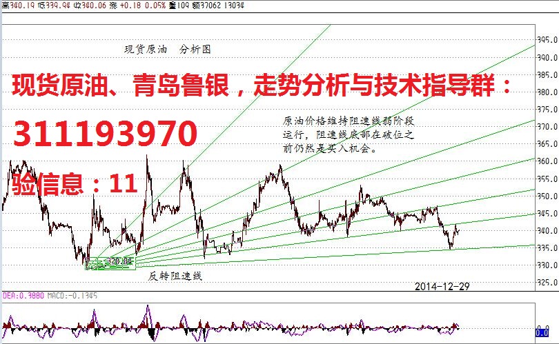 在沙特的预算案中,进入2015年,原油价格是以80美元/桶来计算的,这显现出了对原油价格的一些积极看法。日线图上看,银价持续两周保持着330元上方水平盘整,此位置形成有效的支撑,个人(薇信**)分析此价格是一个相对的底位。BOLL中轨330-360元区间内波动将是近期行情的基调,笔者(薇信**)建议原油现价不要急着埋空,低多为主比较稳健。如果您把握不准行情,欢迎**-昵称-“黄辰鑫”,加为好友,或者添加分析师工作威信(**)。