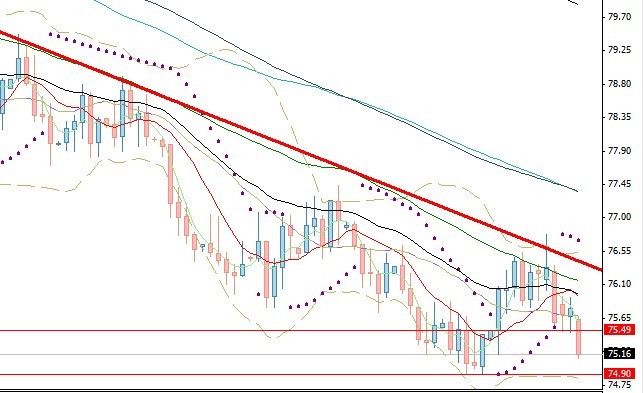 美元指数技术图方面,上周美元受到多重打击的情况下,如淡烈的就业数据、升息希望的幻灭、商品价格屡创新高等因素,美指尽数回吐前周的涨幅,周六的IMF报告更掀开了美指今早的跌势,目前美指已跌至75边缘附近比平,虽然个人预期美指跌势还会持续,但美指今早已累积了一定的跌幅,加上距离74.90亦不远,应谨防美元在支持点附近反弹,故目前价位不应过量看它美元。