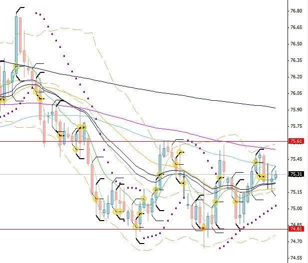 美元指数技术图方面,美指周一创出74.64低位后,整周走势主要是横行整理,4小时图走出一横向区间走势,上下限大约为74.80-75.60;由于今日缺乏重要经济数据,预料今日美指走势将会局限于区间内运行。