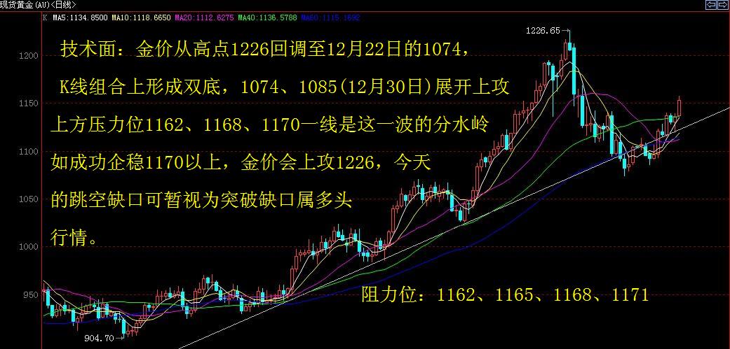 技术面:金价从高点1226回调至12月22日的1074,K线组合上形成双底,1074、1085(12月30日)展开上