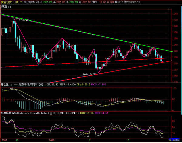 日K线高低点下移,中短期均线呈现出初步空头排列现象,5和10均线分别位于1097和1107左右,MACD绿柱增长,DIFF和DEA下穿0轴,并张口向下运行,RSI已进入24超卖值,RSI自2009年864一线时处于18左右后,之后各低点超卖值,一大部份低位均位于23/24左右。随机KDJ处于超卖区张口向下运行。从画线来看1132连续三天下降连线为本波外则压力线,而内侧压力,昨天和前天二日高点连线,今天此线位于1101左右。4小时短期均线再次张口向下,MACD绿柱波,处于背离状态下缓慢增长,DIFF和DEA依然死叉张口向下运行。RSI已呈现低背离状态,随机KDJ处于超卖区张口向下运行。