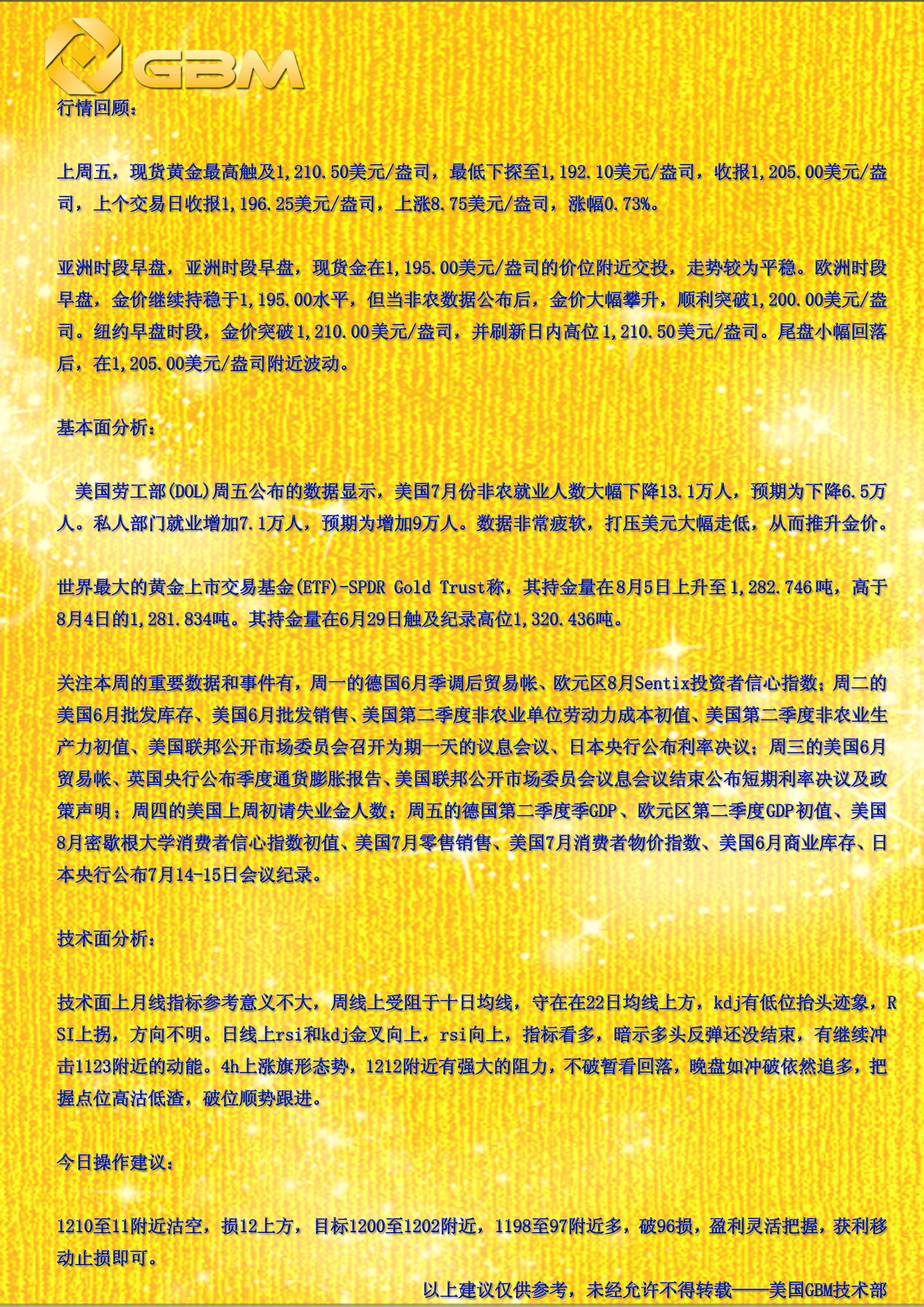 〖美国GBM技术部-Tonny〗2010.08.09黄金行情早评