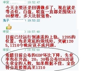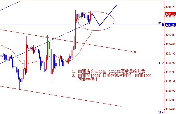 昨日白盘在1199一带整理,盘中未破1197,欧盘站稳1200。从昨日的整理来看,没有突破1197,说明多头还是比较强势的,站稳1200后,将直接突破1210。随后在1206发力,直接跳空突破1210,跟本不给你追多的机会。