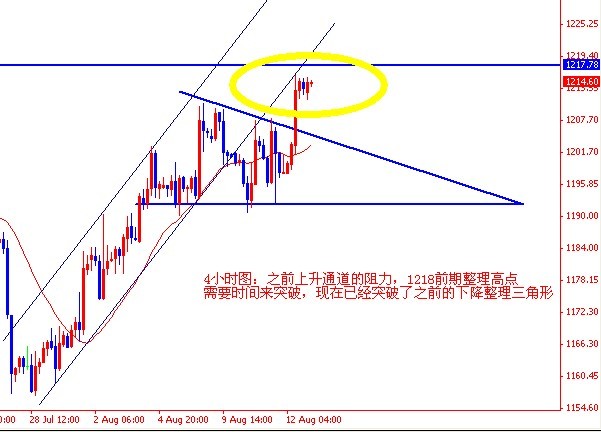 目前已经运行到1218附近之前整理平台的高点,还需要时间来突破,但是现在来看,突破的几率还是比较大的。回调整理的位置在1210,1205附近,将会重拾升势。现在黄金和美元已经因全球经济衰退,在避险情绪的推动下,开始上走,而这也是投资黄金的主要动力,也是推动金价今后继续上行的主线。