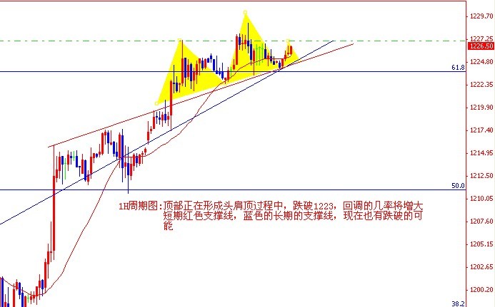 现在1H周期图,顶部正在形成头肩顶形态,一旦跌破1223,回调几率会很大。