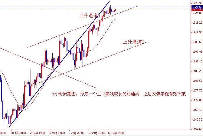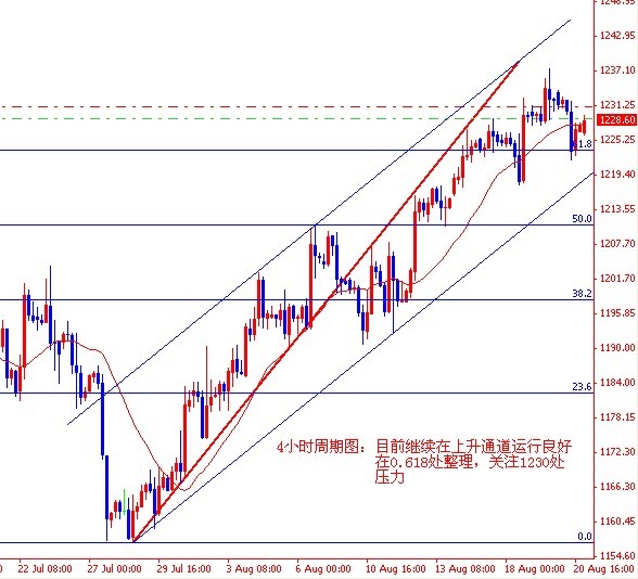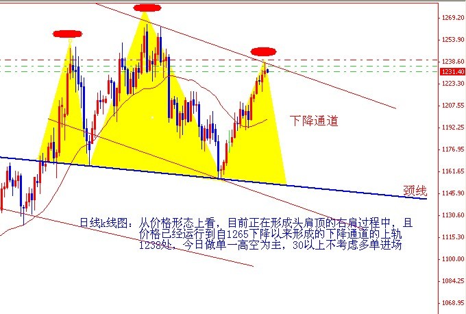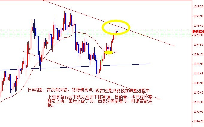 最近3日美盘走势都是窄幅震荡,昨天在上冲30,最高29后,快速回落。显示多头现在向上的力量已经比较弱了,1230处的阻力比较大,昨日的1227的空单可以继续持有。日线在3连阳后,收阴线小十字星,多头力量正在减弱,回调从今天开始的概率比较大,建议大家谨慎做多,空单为主。等待回调之后再做多,现在的主流确实还是做多的。