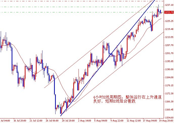 现在的行情在在1156一路上涨以来,涨幅较大。日K线,也接近下降通道的上轨 1238位置。且连续4天的K线组合也显示出上升的动能正在不断减弱,要提防空头的突然爆发。