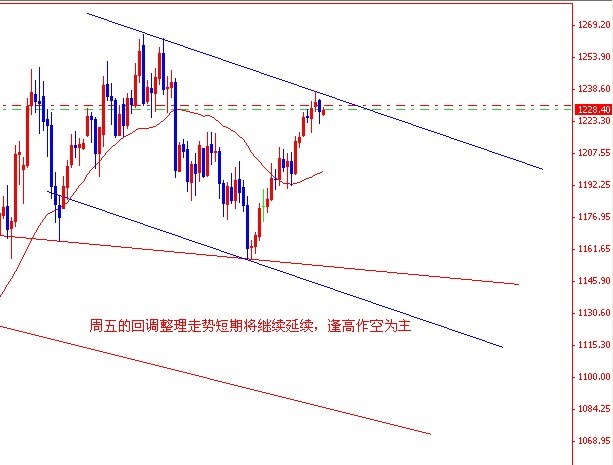 周五金价开始回调,最低至1222。之后反弹至1228整理。日线在经过连续上涨之后,周五的K线出现回调信号。短期回调仍将继续延续,高空为主。