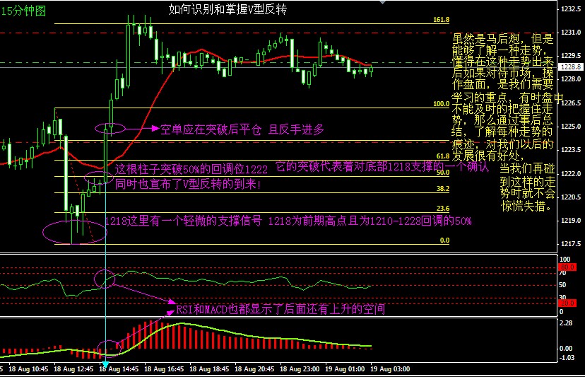 我们一般需要关注其反弹50%的位置。一旦接近50%的回调位我们就需要多加关注。如果小时间框架内(如15分钟图)蜡烛图站到反弹50%的上方,并且其他指标也显示后面还有运行的空间,那就显示V型反转可能到来,一切错的单子要马上手动止损,然后反手*作,正确的单子要先进行移动止损,再轻仓加单(这个需要根据自己的仓位来决定是否加仓和加多少)