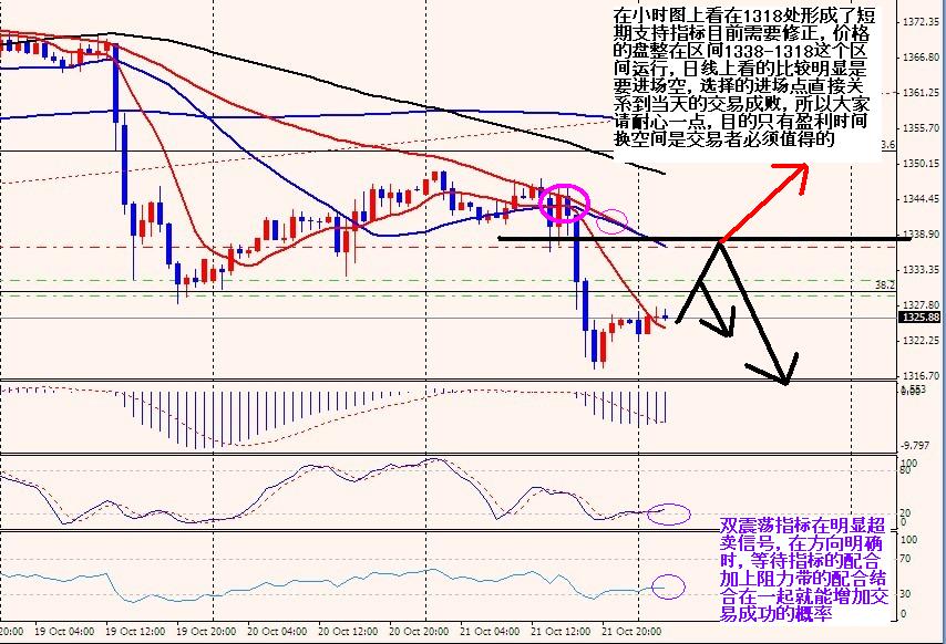 最高1347 最低1317 全天波幅30美元,日线上完全吞没前天的中阳线,在K线上依然继续看空;连续在日线上出现两次阴阳相间的K线 ,再次出现小幅盘整概率较大,可以参考的是日线的MACD来判断目前方向,能量柱逐渐减弱,空方动力明显强劲,在昨晚1337-1348一带拉锯时多空再次试探了双方的决心下多方没有尽力冲上1350关口所以价格直接下挫。