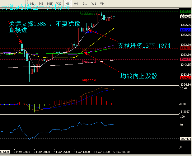 今日高位不追多,下方支撑进多,关键支撑1385 1374 1365 ,稳健的选择在1374 1365带损进多,不要做空单。把握好趋势,涨势刚刚开始而已,今日有非农数据,大家谨慎进场,我的帖子中提到过黄金疯狂的十一月份,机会来临,保持简单的思路即可。