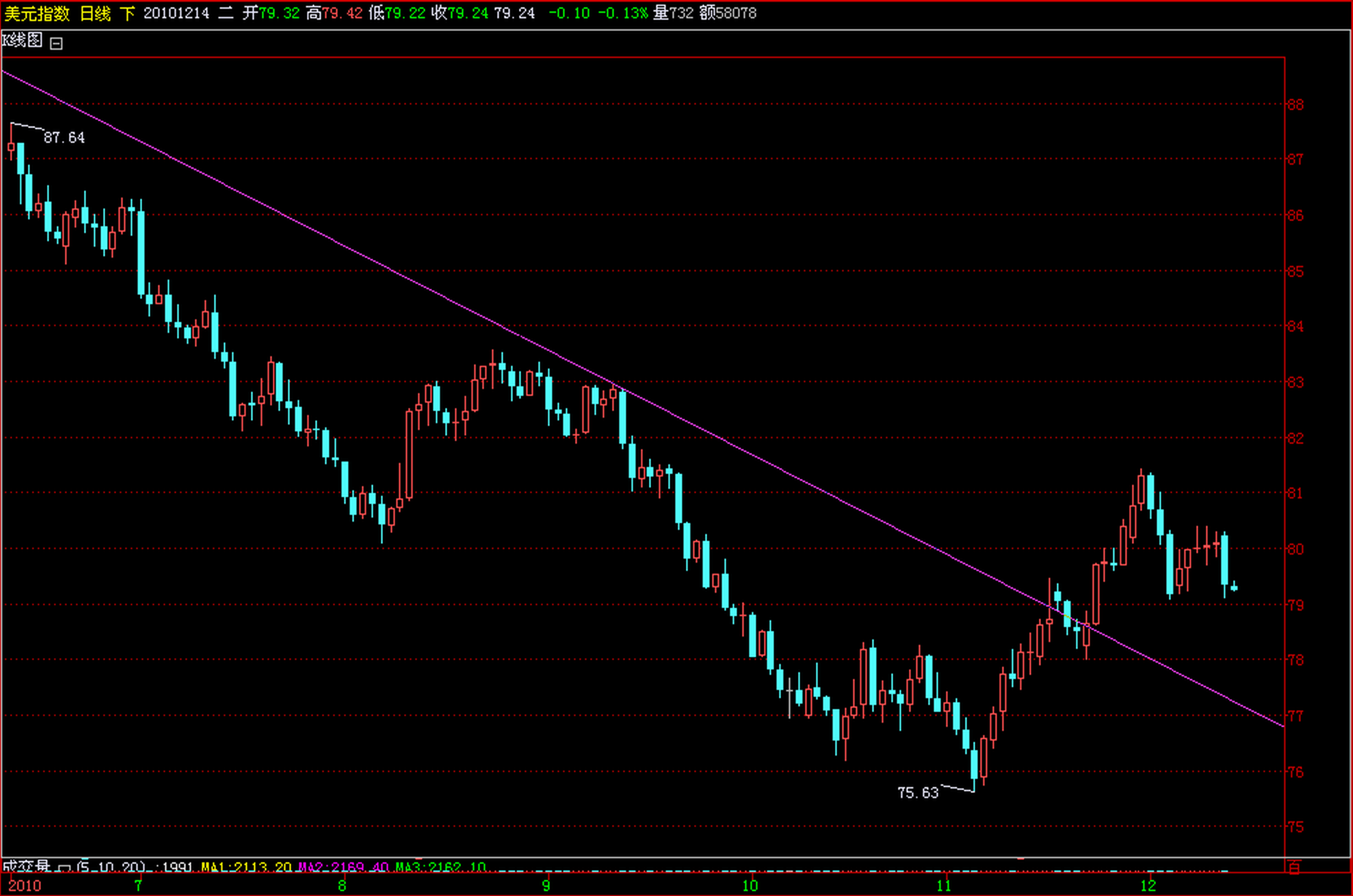 在升破下降趋势线后,最高探到81.50的年线附近回落,但只要价格没有回落到趋势线内,可以看做美指还有上升的空间,压力80.45,支撑79.10,78.63