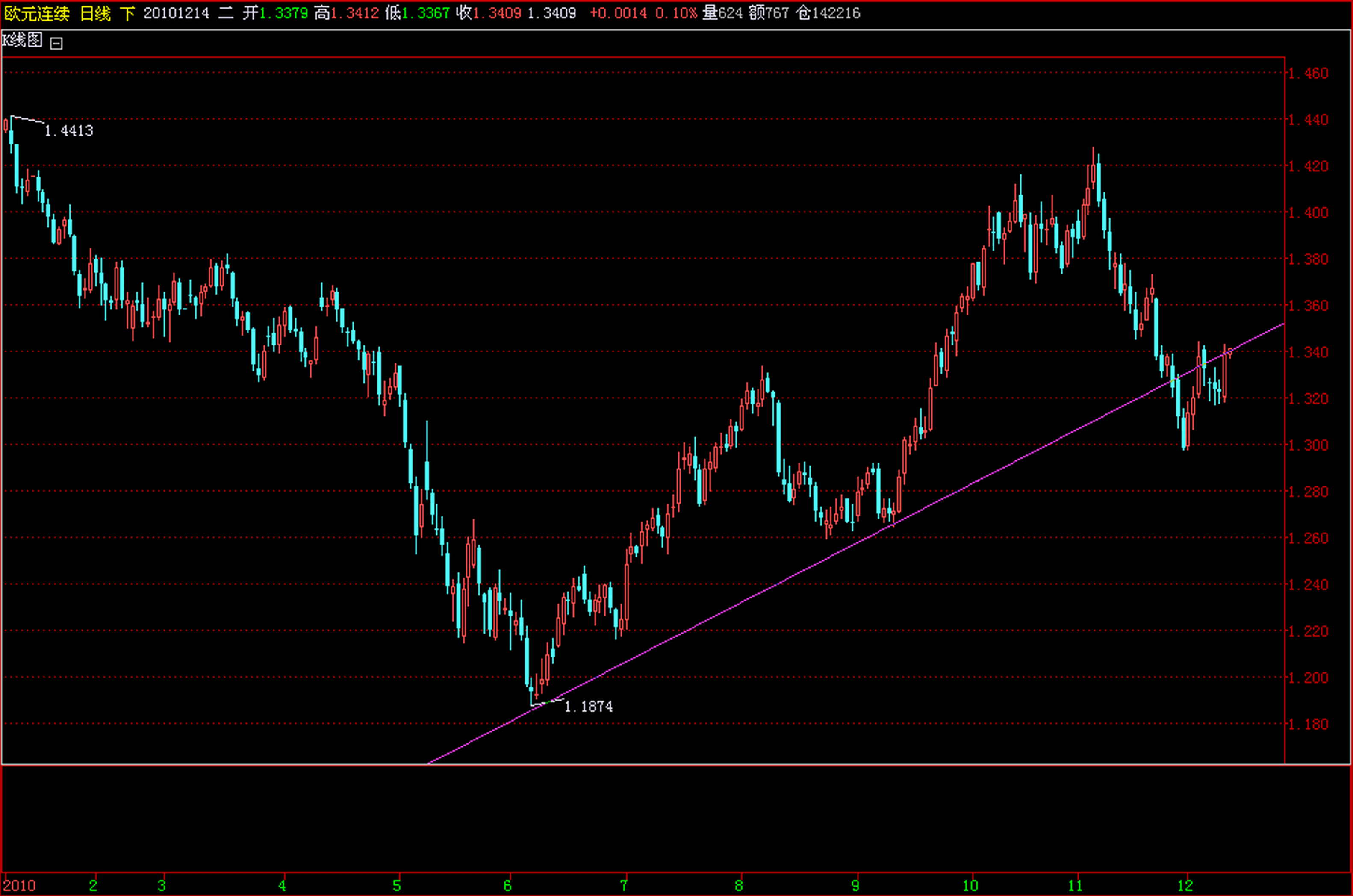 欧元的K线在跌破1.33后的上升趋势线后昨晚回抽趋势线,只要没有连续2个交易日重新站在趋势线上方,欧元将持续跌势,拖累黄金的走势。压力1.34
