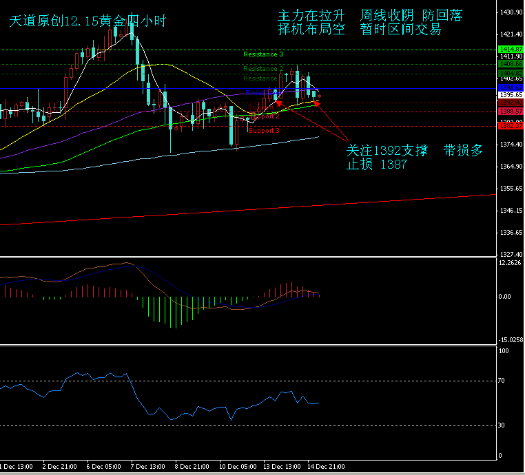 昨日黄金如笔者策略所写在区间1392 1407整固 ,日线收倒垂线,多空势均力敌,力量均衡。接近年末,且周线收阴,所以黄金回落风险很大,但主力不会这么容易就让我们捕捉到市场机会,想继续诱多,我们就将计就计顺势而为,带好止损,看主力的诱多拉升到什么点位。短线策略继续低多 ,中线布空关注上方高点 1407 1417 。感谢大家支持,我们天道团队会以最认真的态度为大家提供好的建议。