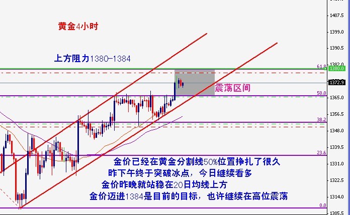 交易策略:回调至1366附近做多,止损3美金,目标看1380。其它要##面变化即时交易。