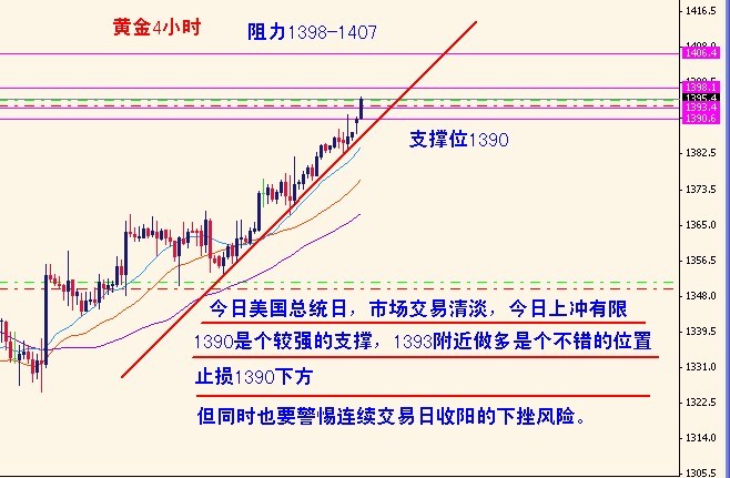 今日交易策略:1393附近做多止损1390下方,上方阻力1398-1407或更多。阻力位1398做小空止损3美金