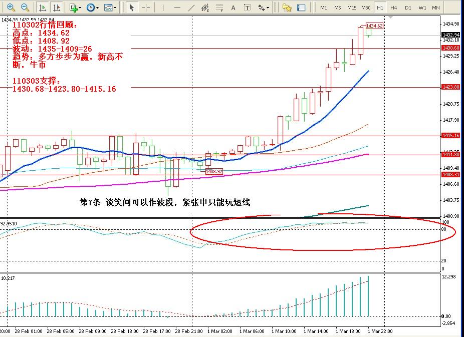 2、做多:1427做多,止损两个点,目标:1430-1434