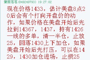 昨天给大家的建议很简单,就是见1425,1426渣货即可,目标位置新高!昨日还是比较符合预期,渣在了最低点附近!然后一路直接破位拉上!当然昨晚唯一美中不足的就是价格最高只到1441,未能创下新高,和预计有点出入!所以我在盘中建议大家1426一线的多单日交易的朋友在1440到1442区域选择获利了解,持仓的保本损待收盘!但是我想大家执行下来,收益还是不错!