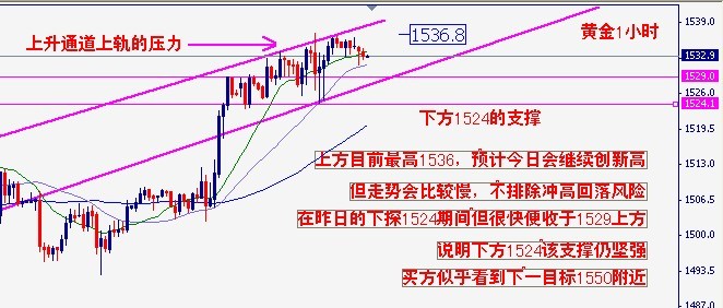 交易策略:建议短线*作为主,顺势做多,黄金现已站上1524上方,等回调至1530附近轻仓短多止损1524下方,目标1535,如继续下探1425,可在这继续试多。止损30点,目标1535。如果跌破1524,会在前期高点1517位置寻找支撑。